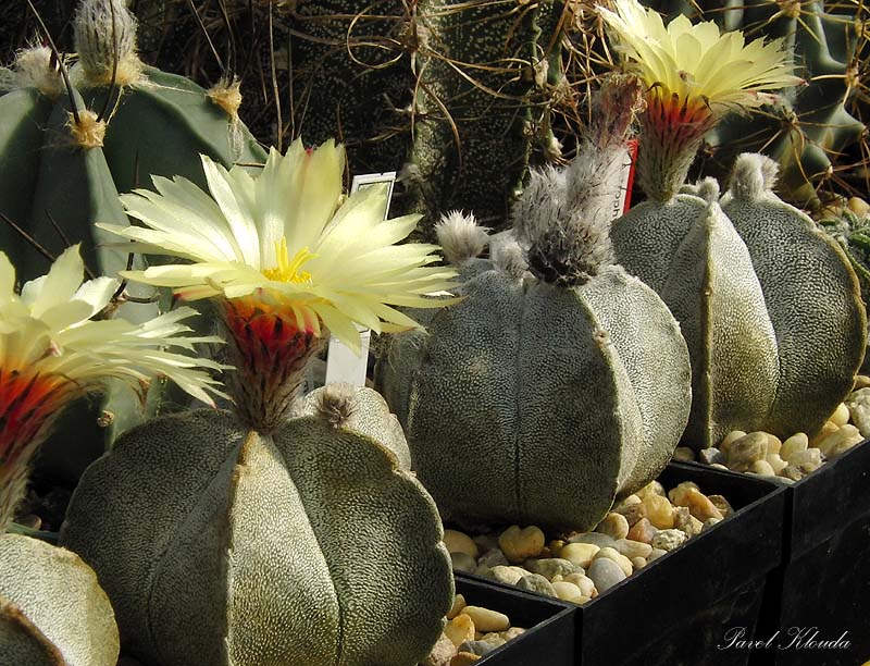 Astrophytum myriostigma - Známé také jako biskupská čepice. Středně velké beztrné rostliny.Stonek jednotlivý, kulovitý, později válcovitý až 150 mm široký a až 0,5 m dlouhý; žeber 5-6, přímých s ostrými hranami, pokožka tmavozelená, matná, pokrytá četnými vatovitými bílými vločkami. Trny chybějí, květy 35-55 mm široké, světle žluté až žluté barvy.Má stejně jako A.Capricorne několik variet :astrophytum myriostigma columnare a astrophytum myriostigma tulense, čtyřžeberné je astrophytum myriostigma quadricostatum, vícežeberné pěkně zaoblené je astrophytum myriostigma strongylogonum, bez vloček je astrophytum myriostigma nudum